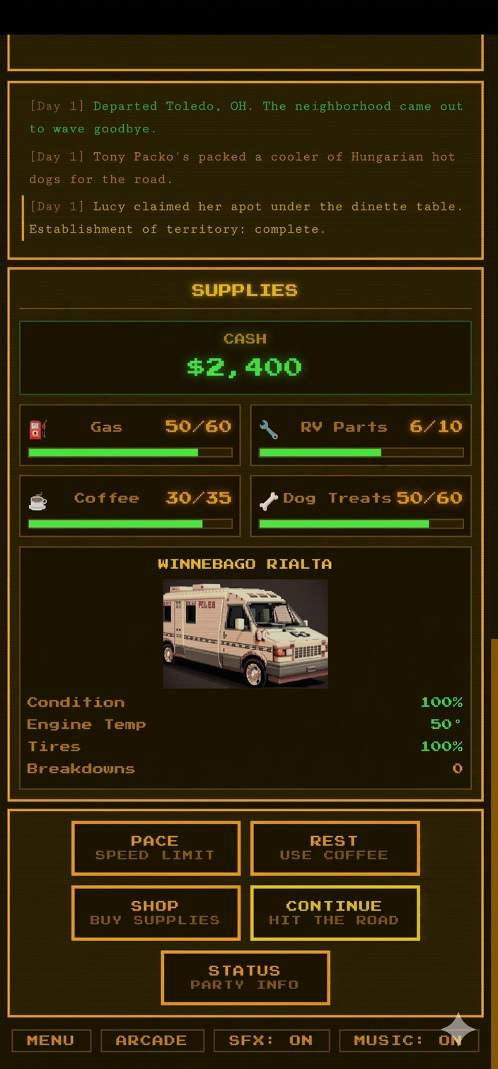 - **Party management** — track health, morale, and bonds between Jeff, Sue, Big Mac, and Lucy. Conditions like CARSICK, ANXIOUS, CAFFEINATED, and ZOOMIES affect gameplay.
